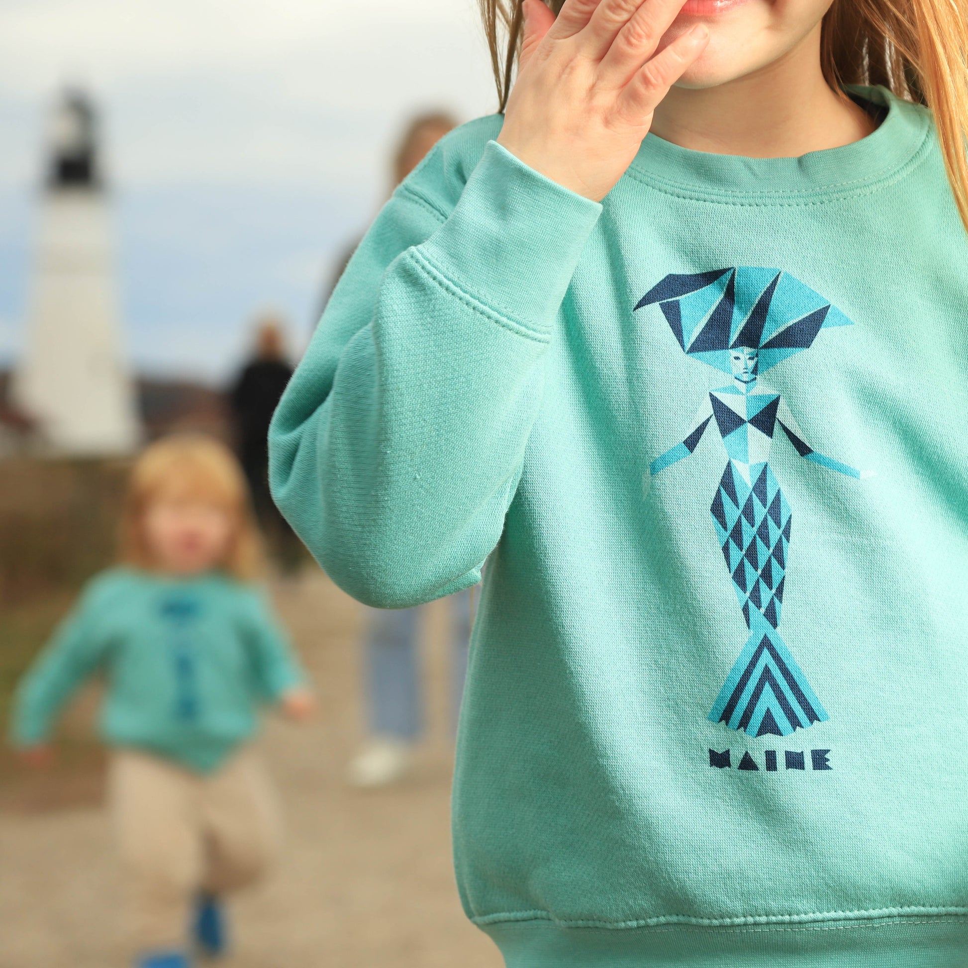Mint crewneck sweatshirt with the Mermaid print for tinys. Printed using Matsui water-based inks on a cotton/polyester by the ARM Factory in Portland, ME.