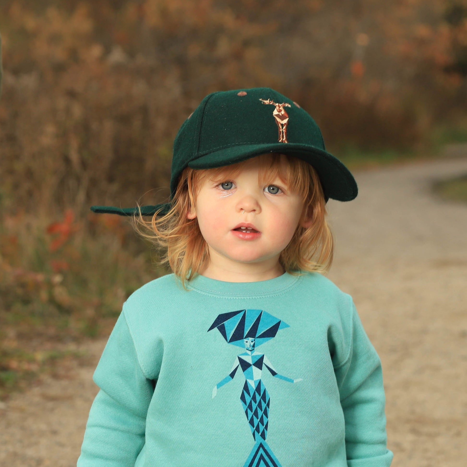 Embroidered geo moose on a felted wool forest green adjustable fit cap. Maine is embroidered on the closure and sizing strap with a folding cleat buckle for sizing. This hat is as cozy as it looks.