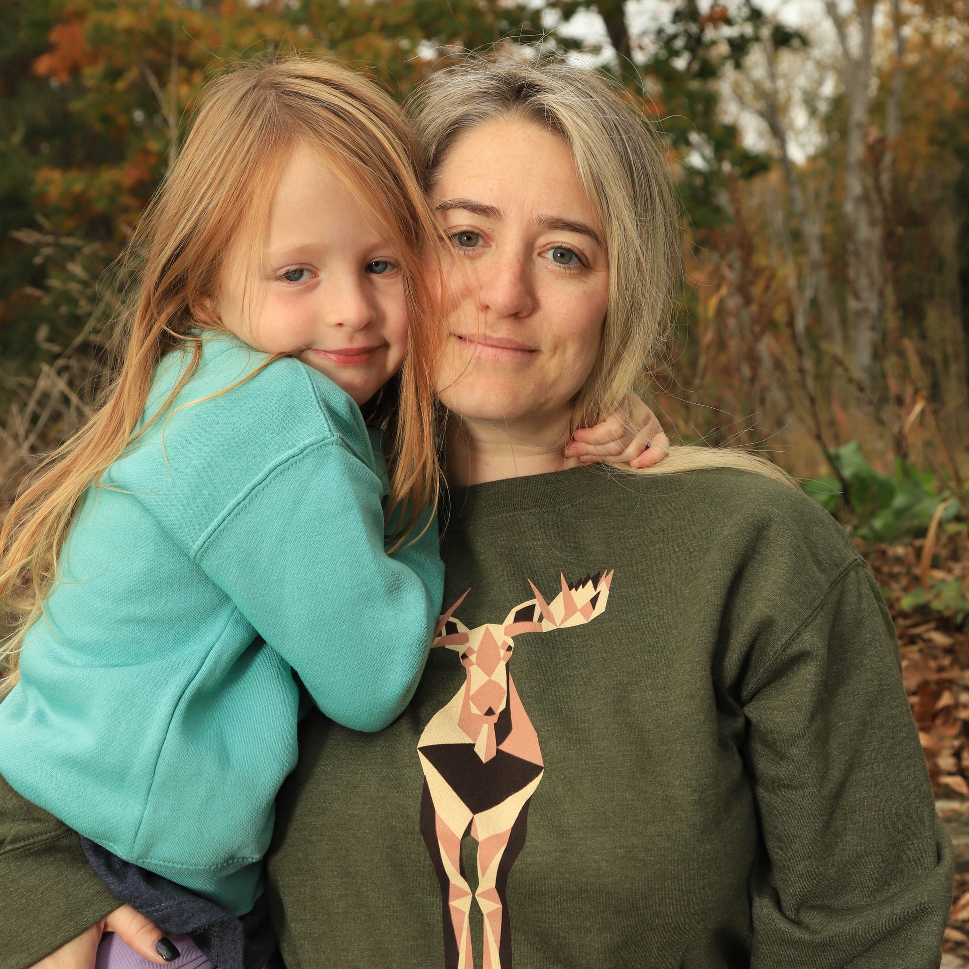 Geometric moose print on a cotton/poly heathered olive green crewneck sweatshirt from Independent Trading Company. Printed by the experts at Arm Factory in Portland, ME these sweatshirts are printed with vibrant water-based inks. The perfect gift for a Maine lover or souvenir of your visit to Vacationland!